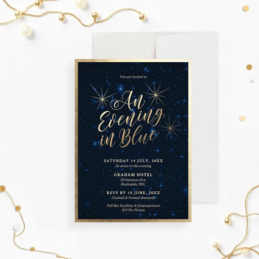 This exquisite invitation displays a stunning starry night sky adorned with golden stars and intricate typographic elements. The invitation is eleg...