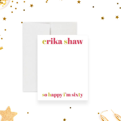 Translation missing: en.product_price.item.price.range_htmlOriginal price$25$25Current price $25| /Celebrate a milestone in style with our "So Happy I'm Sixty" notecard, which adds a playful twist to turning sixty! This vibrant card is adorned wi...