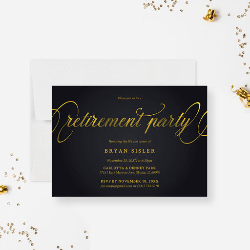 It's a wrap! Celebrate the conclusion of a golden career with our retirement party invitation template. This design combines elegance and festivity...