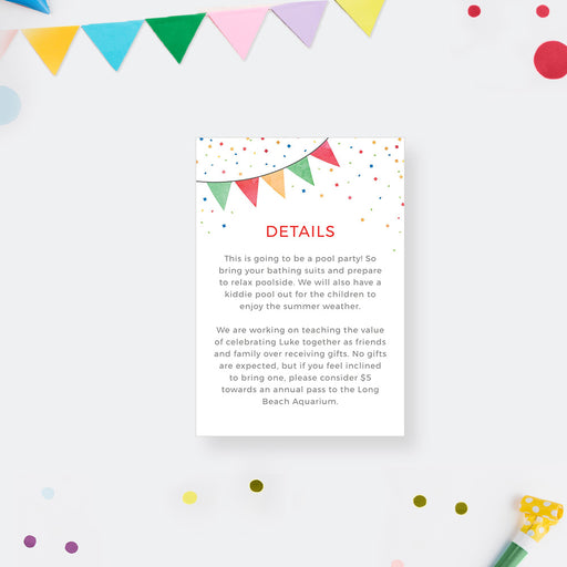 Make your party planning a breeze with this colorful information card. With its festive confetti and party flag design, it's sure to add an extra t...