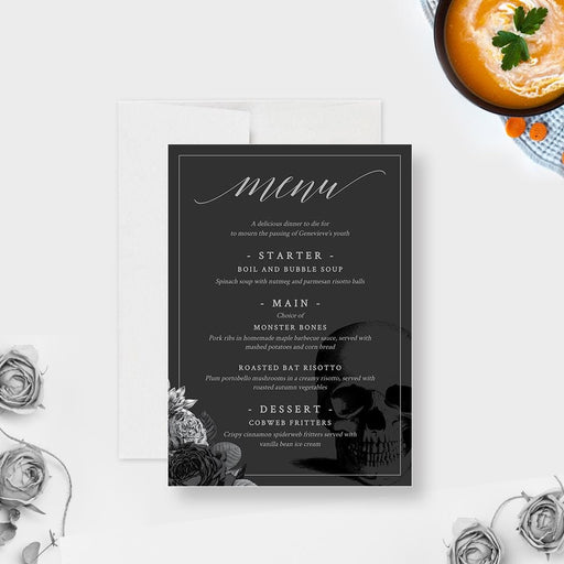 This menu card is elegant and unique, featuring a skull illustration with silver and black flowers. The back of the card showcases a skull pattern,...
