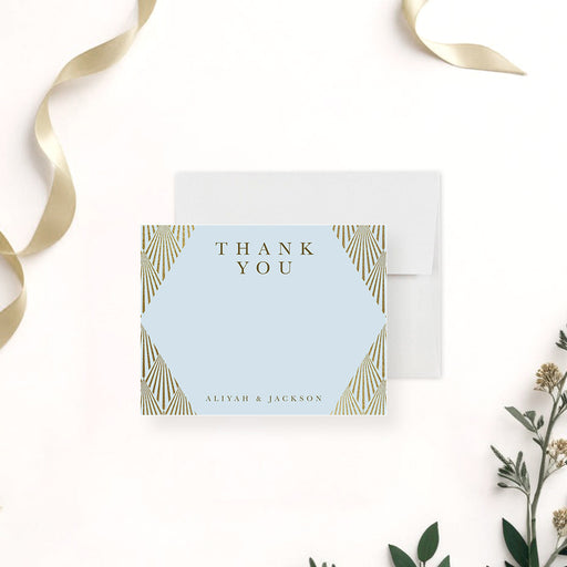 Seal your celebration with a touch of timeless elegance using our art deco thank you card, beautifully designed in deep navy with a rose-colored ge...