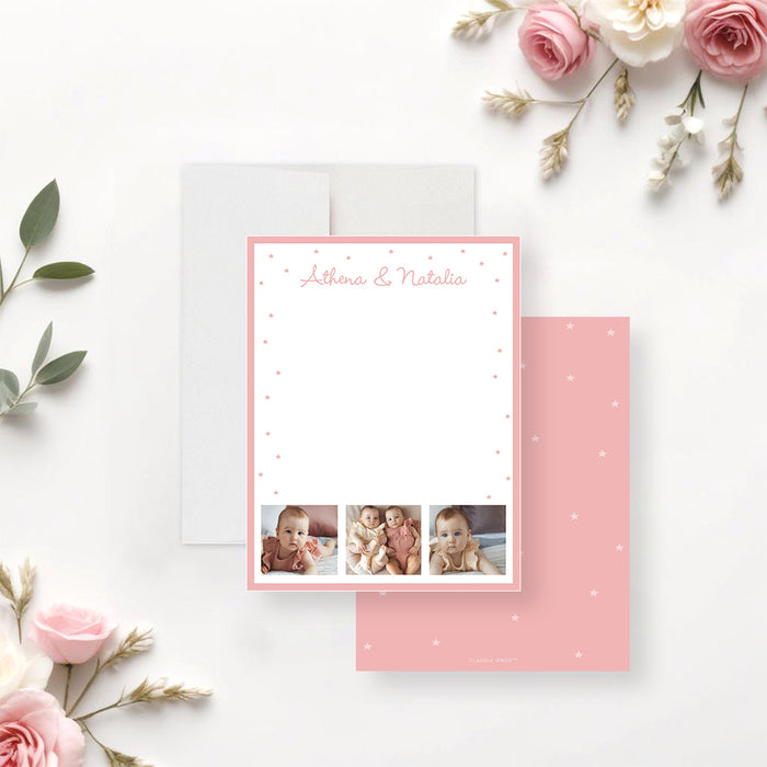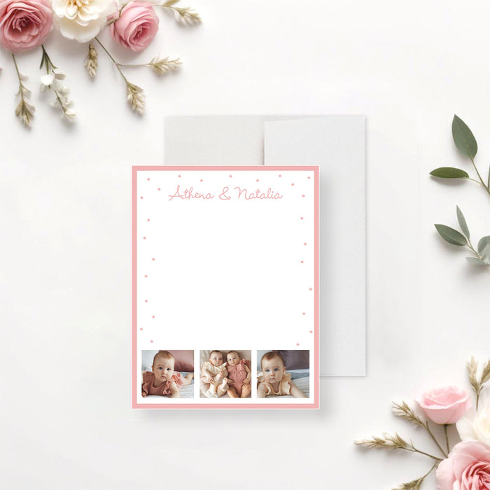 Custom Note Card for Twin Baby Girls with Photos, Adorable Baby Shower Stationery Featuring Little Stars, Thank You Card for Baby Baptism