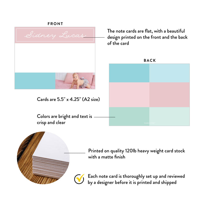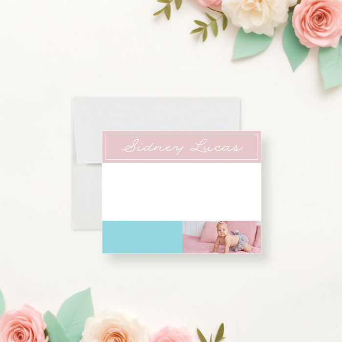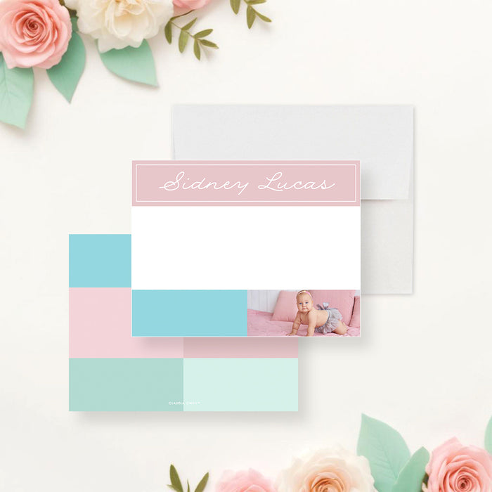 Express your gratitude in the sweetest way with this elegant pastel note card, designed for baby girls. Featuring soft, gentle colors and a space for your baby's photo, this charming card adds a personal and heartfelt touch to your thank-you notes. Whether you're thanking guests after a baptism, baby shower, or special celebration, this design makes your message feel extra special and memorable.