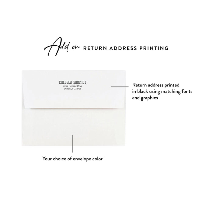 RETURN ADDRESS PRINTING. Take the hassle out of addressing your envelopes by adding return address printing. The black ink printing on the envelope flap will match the font and style of your personalized note cards, giving your entire set a cohesive look.