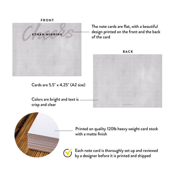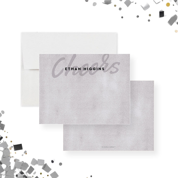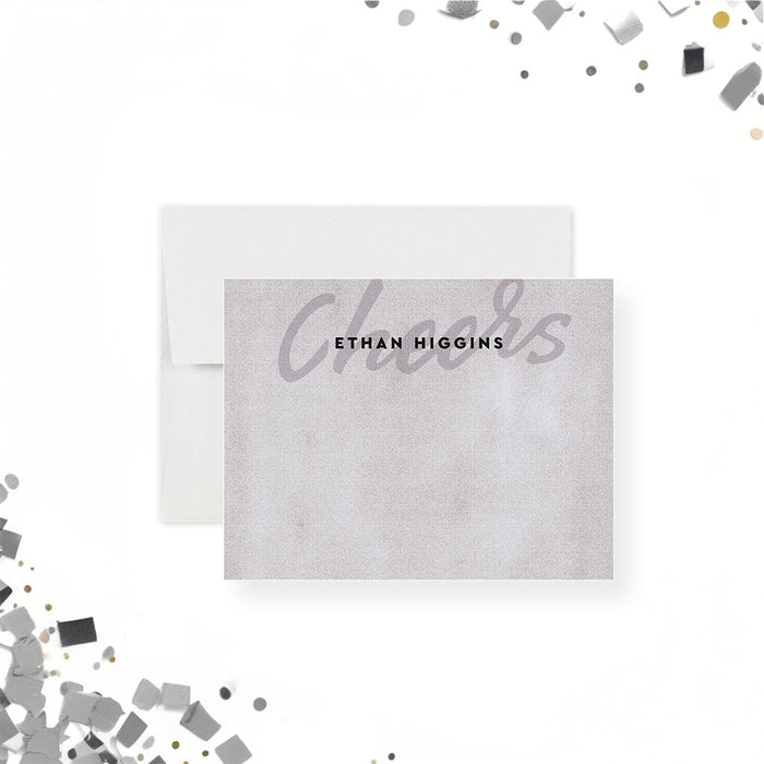 Craft each message with care using this personalized note card, suitable for any event. Showcasing a sleek gray textured backdrop with the word "Cheers" in contemporary script, this card is ideal for conveying warm birthday greetings, sincere thank-you messages, or personal notes of gratitude.