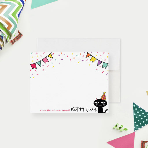 Make every message paws-itively festive with this playful cat-themed note card! Featuring a party-ready black cat in a striped hat, colorful confet...