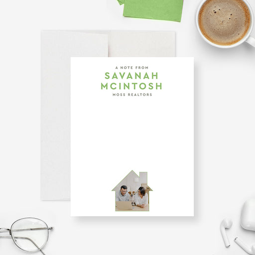 This notecard would be ideal for real estate agents, featuring a sleek and minimalist text layout on the front, accompanied by a distinctive house-...