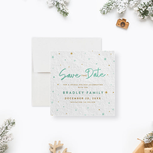 Family Holiday Save the Date Card with Blue and Gold Snowflakes, Winter Themed Save the Date Card