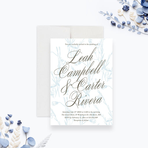 Capture the essence of timeless romance with this elegant invitation, featuring soft, hand-drawn botanical illustrations paired with graceful calli...