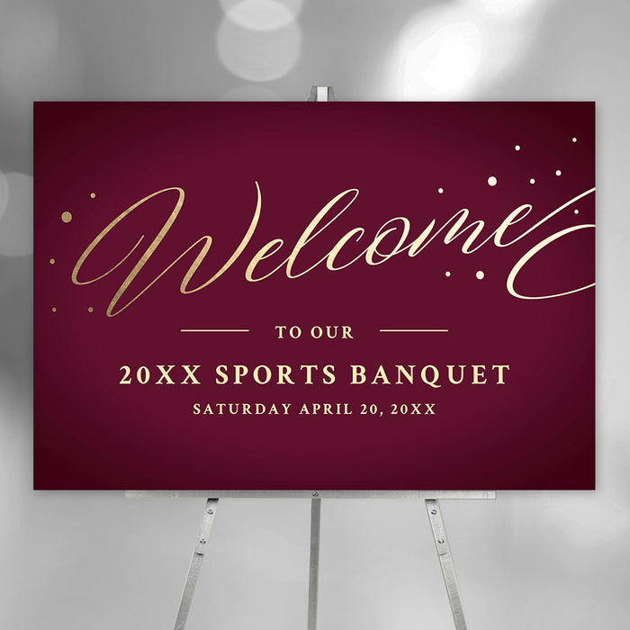 Set the tone for an unforgettable evening with this elegant burgundy and gold welcome sign, custom-designed for sports banquets, formal celebrations, and corporate events. With a rich maroon background and gold typography, this personalized welcome sign provides a refined yet festive touch.