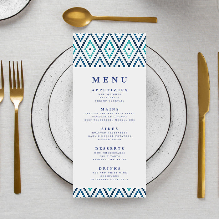 Printed on high-quality white matte paper, this 5" x 7" wedding invitation card is designed to be both timeless and trendy. Whether you're exchanging vows by the sea or hosting a chic garden celebration, this invitation sets the tone with its elegant layout and cultural flair. The bold tile design evokes a classic charm, perfect for Spanish, Greek, or coastal-inspired weddings.