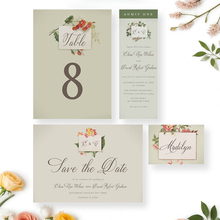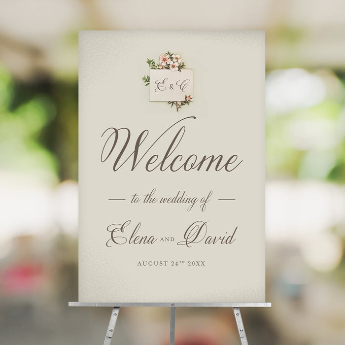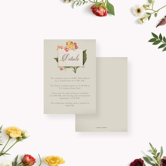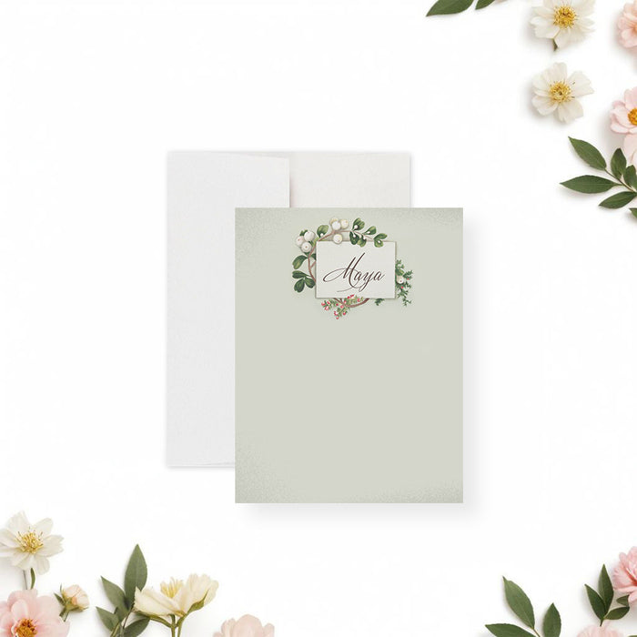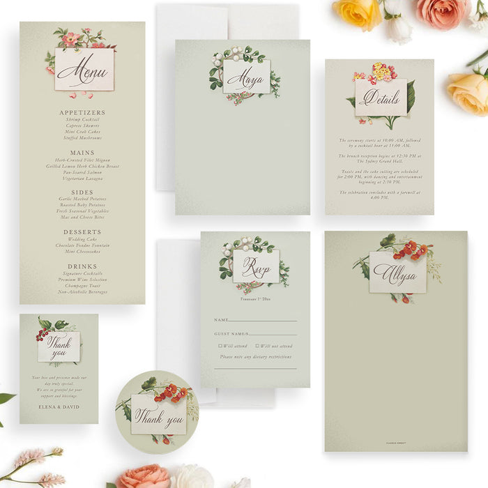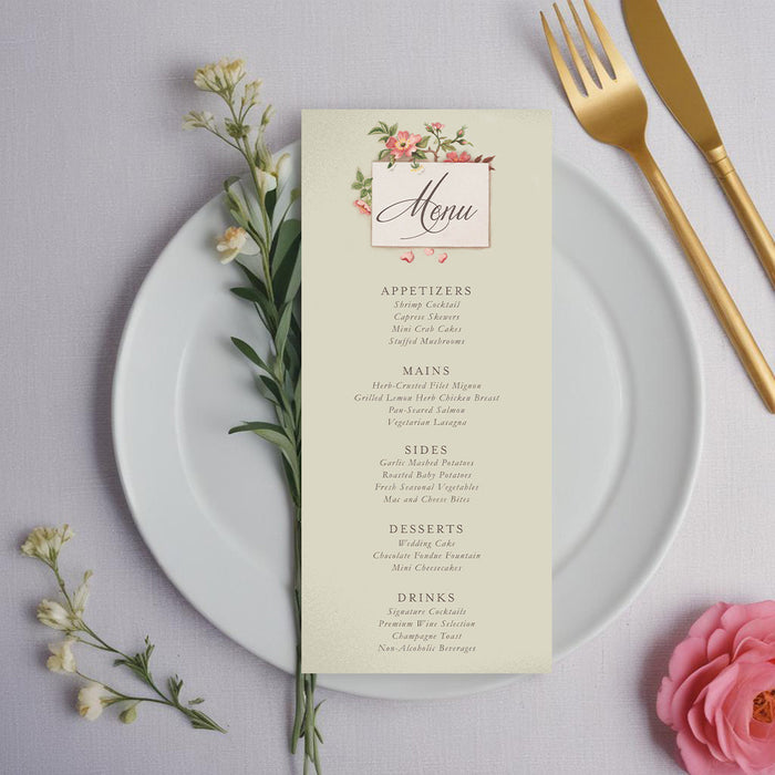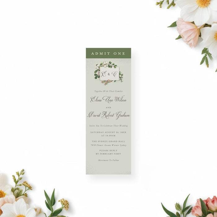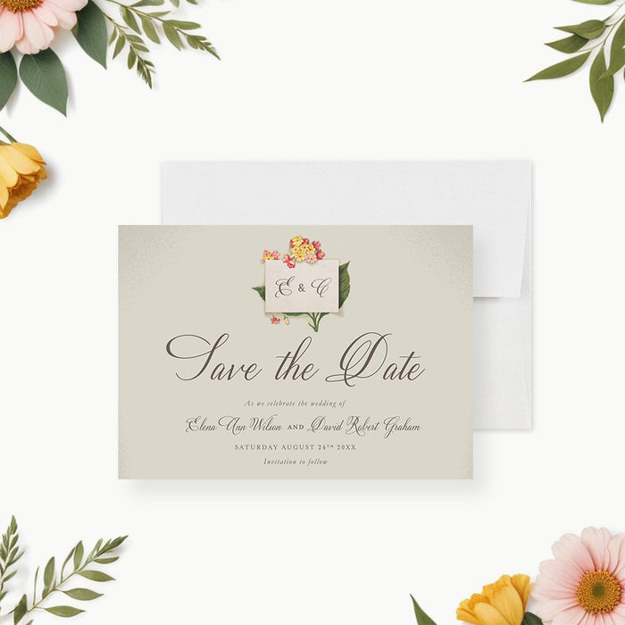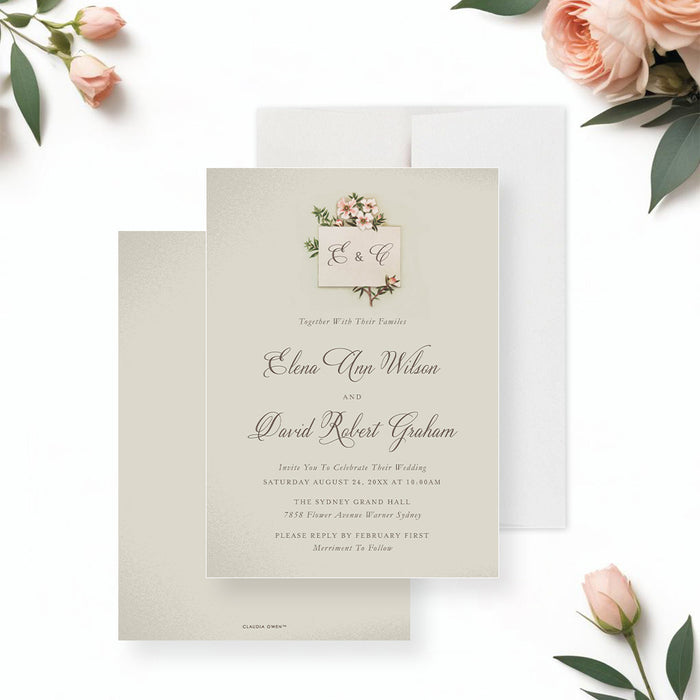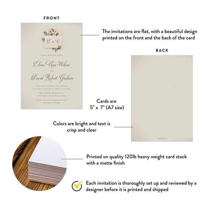 Printed on high-quality white matte paper and measuring 5" x 7", this custom printed invitation boasts a soft cream background, delicate floral illustrations, and a monogrammed detail at the top. It’s perfect for couples planning a botanical wedding, a formal garden celebration, or a classic spring or summer wedding.