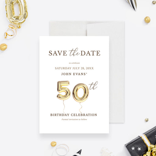 Celebrate a fantastic 50th birthday with our save-the-date invitation template. This elegant design features golden balloon numbers that add a fest...