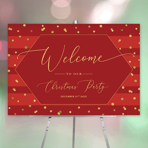 Welcome your guests in style with this elegant red and gold Christmas party sign, designed to add a touch of festive elegance to your holiday celeb...