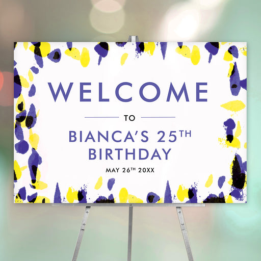 Brighten your celebration with this vibrant welcome sign, showcasing bold abstract brushstrokes in yellow, purple, and black. This artistic signage...