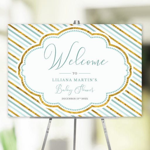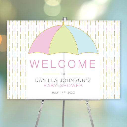 Celebrate the impending arrival of your little one with this charming baby shower welcome sign. Adorned with delicate golden raindrops and a sweet ...