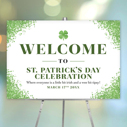Greet your guests with a burst of Irish charm and festive cheer using this St. Patrick’s Day welcome sign. Featuring bold green typography, glitter...