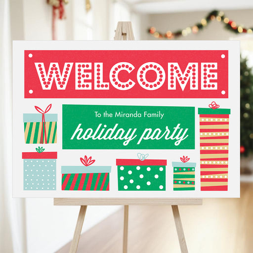 Greet your guests in style with this cheerful and festive welcome sign. Featuring a vibrant red and green design with charming gift boxes and playf...
