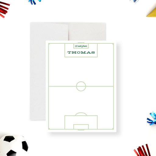This note card is the ultimate stationery for soccer-loving boys! With a soccer field outline on the front and a vibrant green backdrop adorned wit...