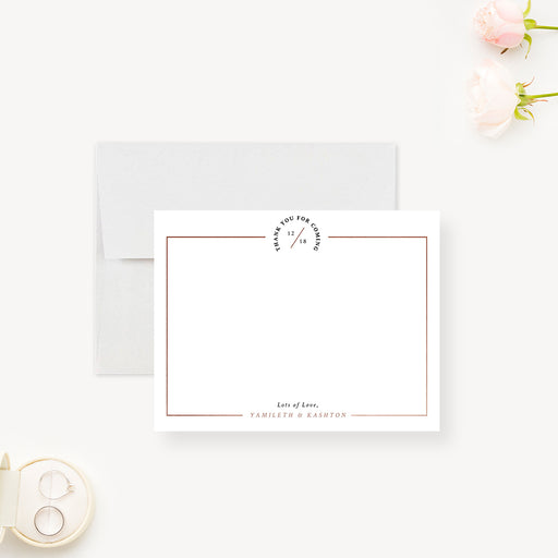 Express your heartfelt gratitude with our chic wedding thank you note card, featuring an elegant copper border with stamp design set against a time...