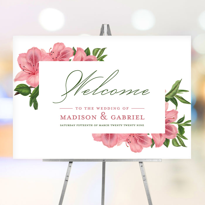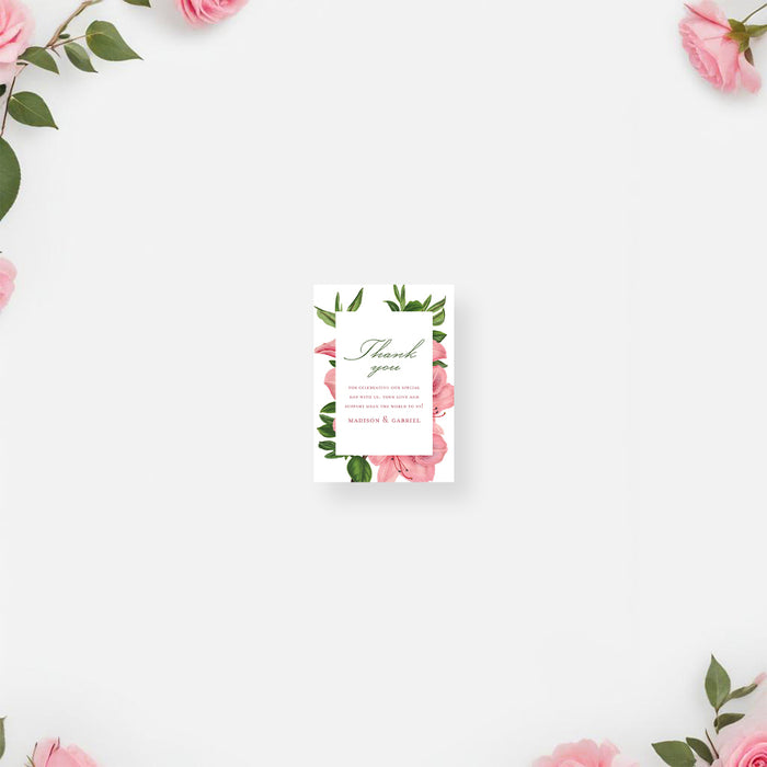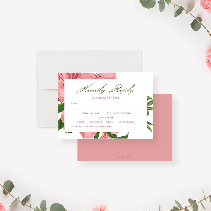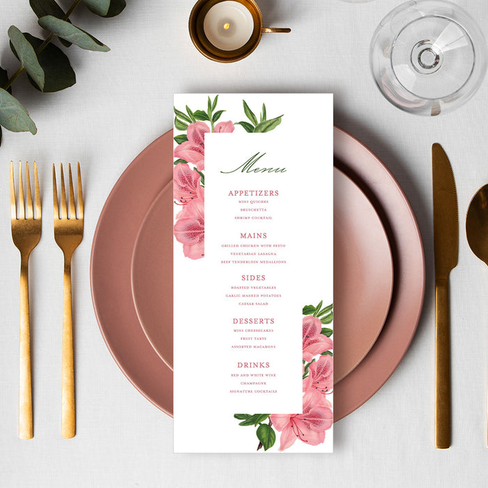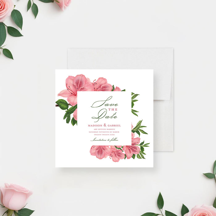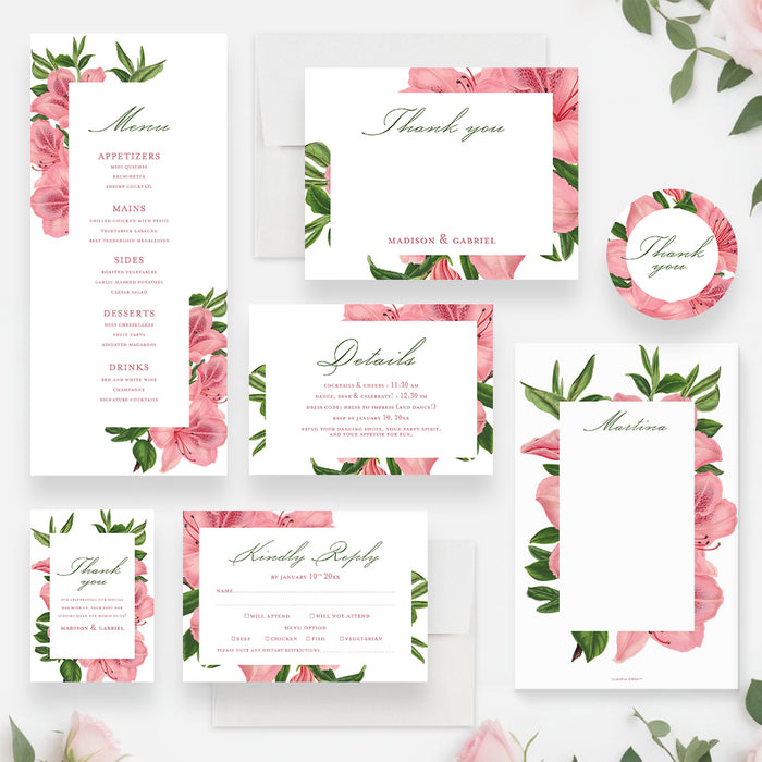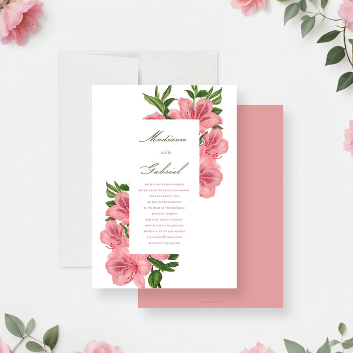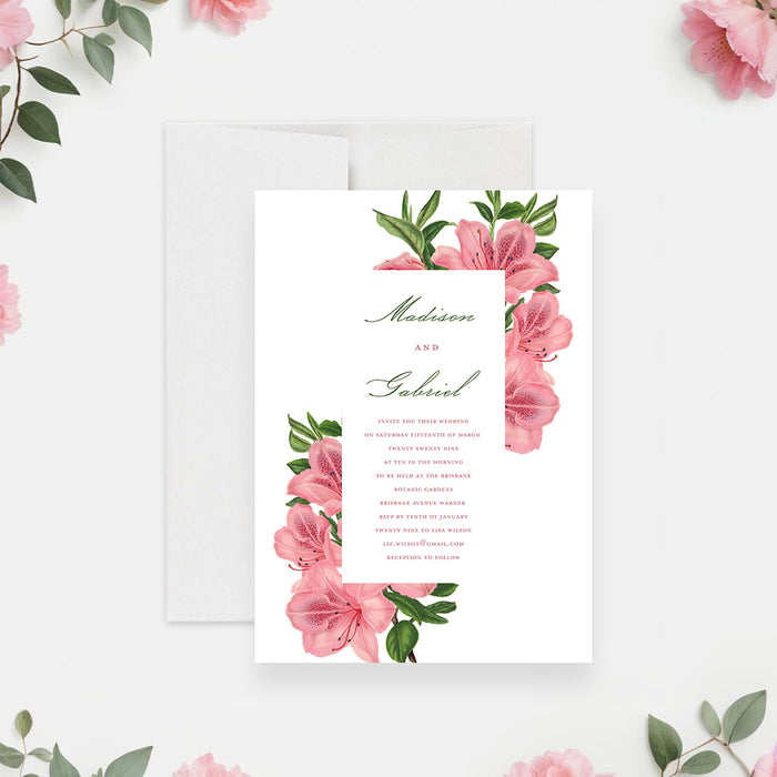 Celebrate your big day with this elegant floral wedding invitation featuring rhododendron flowers and soft green leaf illustrations. Perfect for garden weddings, spring wedding celebrations, or even floral bridal showers, this beautifully crafted, custom-printed invitation is the ideal choice for couples seeking a stylish yet timeless aesthetic.