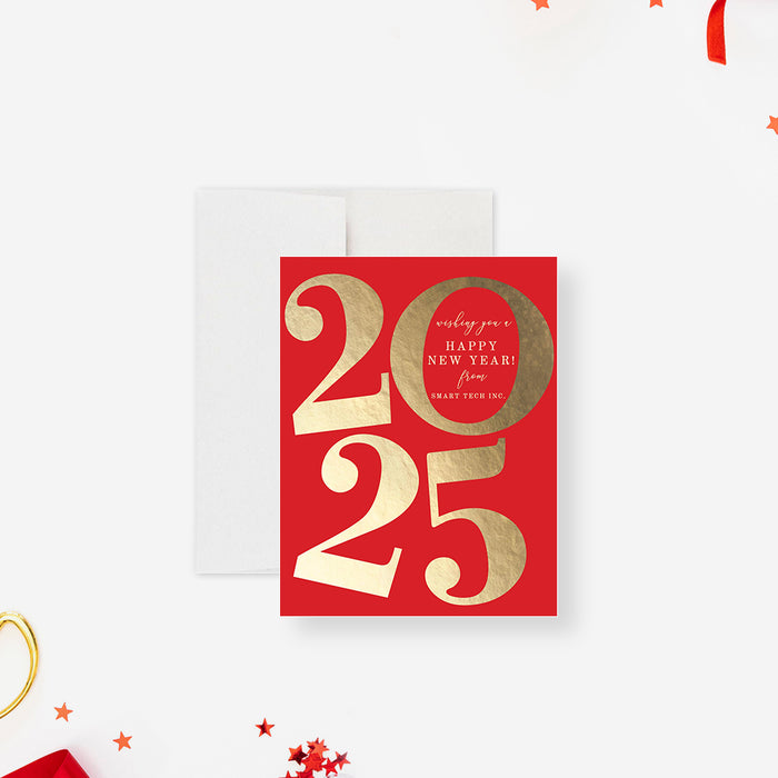 Welcome the beginning of a new year with this new year greeting card. This card is a thoughtful way to send a cheerful message to clients, customers, and employees, letting them know you’re thinking of them this holiday season. It features elegant modern typography in gold on a festive red background.