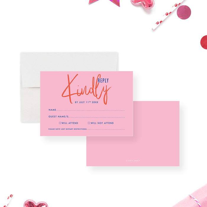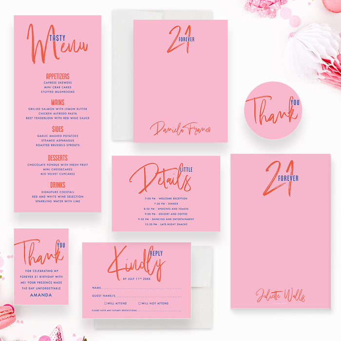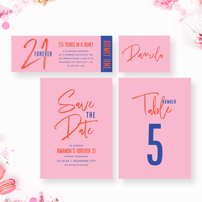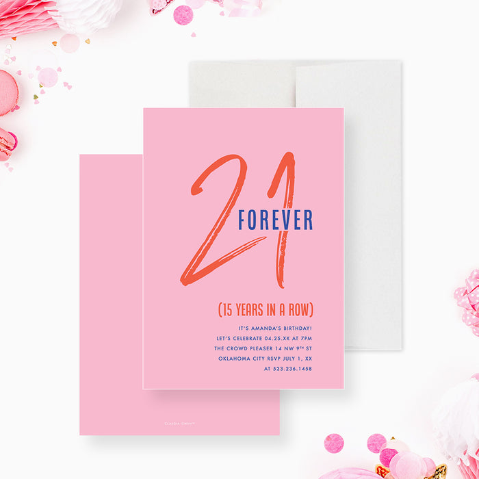 Celebrate another fabulous year of being 21 (again!) with this playful and vibrant birthday invitation. Featuring a bold pink background, red and blue typography, and a splash of cheeky humor, this "Forever 21" card is the perfect way to set the tone for a celebration where age is just a number and staying forever young is the ultimate vibe. Whether it’s your 1st or 15th time turning 21, this invite promises a night full of laughter, joy, and unforgettable memories.
