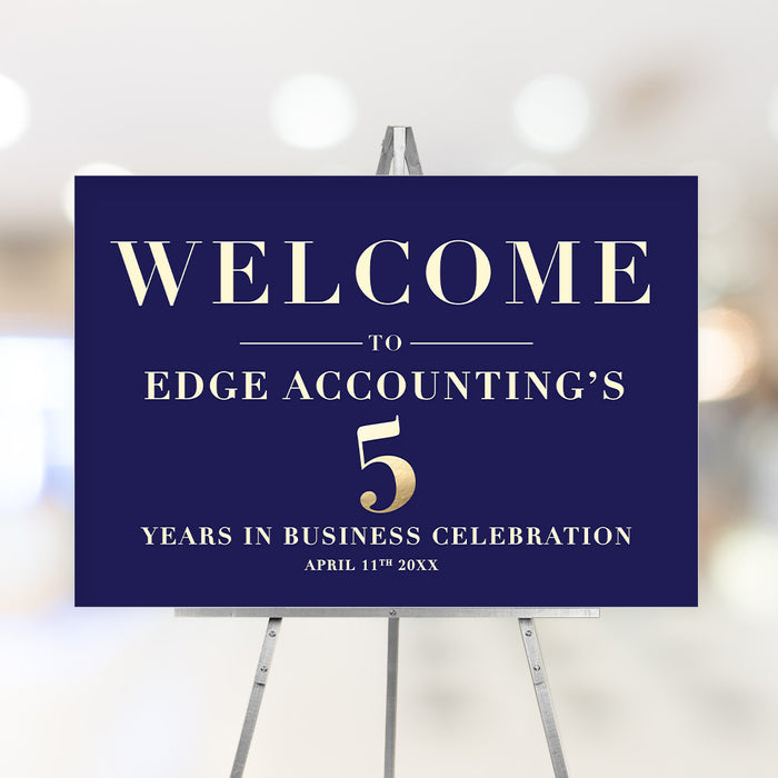 5th Business Anniversary Welcome Sign in Blue and Gold