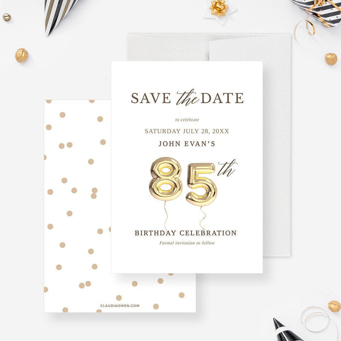 Prepare for a milestone celebration with our beautifully designed digital save the date card! This elegant card features a gold balloon that perfectly highlights the momentous occasion of an 85th birthday celebration.