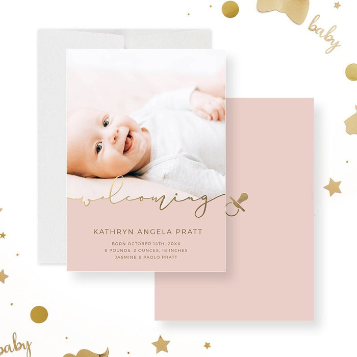This charming baby announcement card beautifully introduces your little one with a soft and elegant design. The large, gold "welcoming" header adds a touch of warmth, while the baby’s name, birth details, and parents' names are displayed below in a simple yet refined font. The photo of your newborn adds a personal, heartwarming touch, making this card a memorable way to share your joy with family and friends.