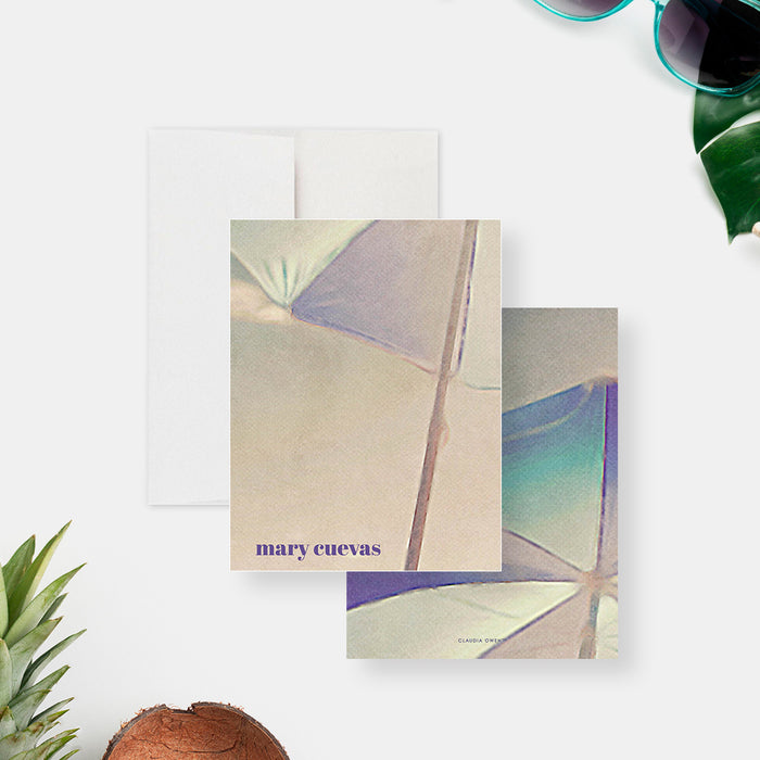 Infuse the calming essence of the shore into your correspondence with this beautifully personalized beach umbrella note card. Showcasing a soft pastel illustration of a sunlit umbrella, this card is ideal for summer notes, thank you messages, or chic personal stationery. With its coastal-inspired charm, it adds a breezy yet elegant touch to any written moment.