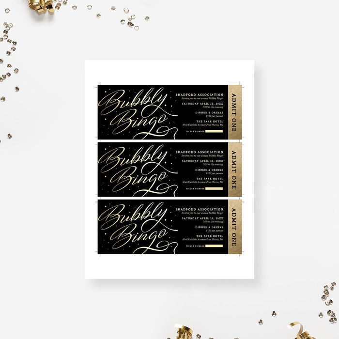 Bingo Ticket Invitation Template, Bubbly Bingo Black and Gold Admit One Digital Download