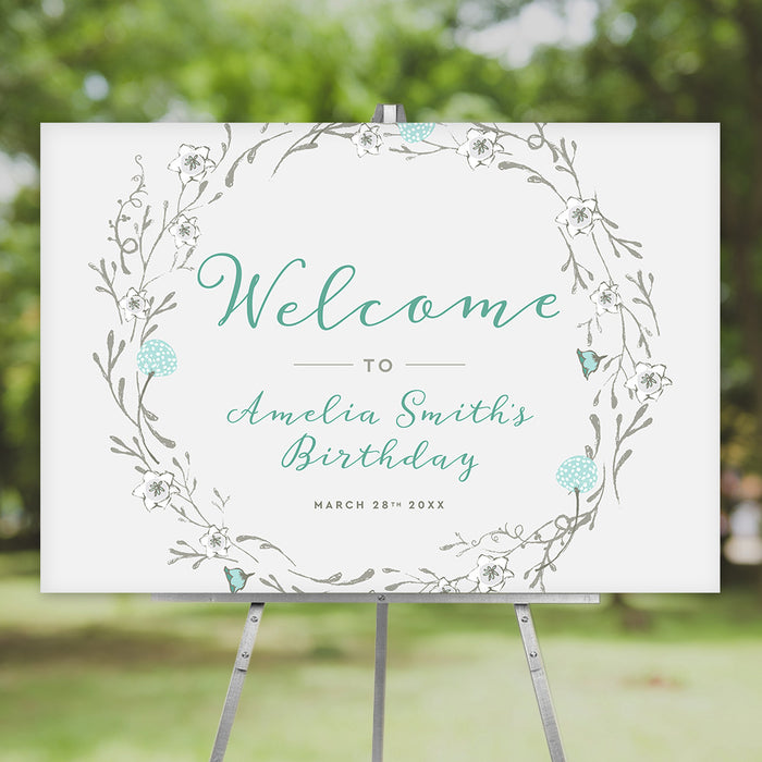 This enchanting birthday welcome sign. Featuring a delicate botanical wreath adorned with soft greens and dainty flower illustrations, this design is perfect for outdoor gatherings, garden parties, or any celebration with a nature-inspired theme.
