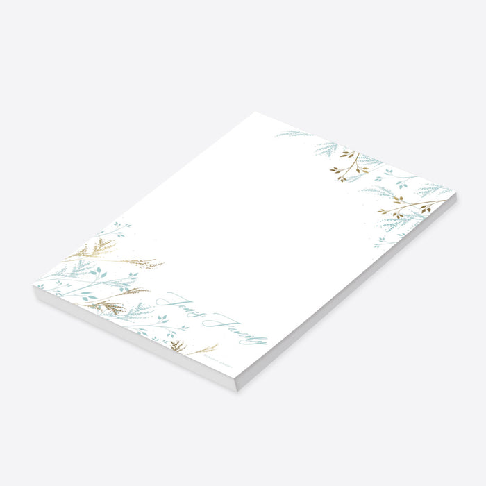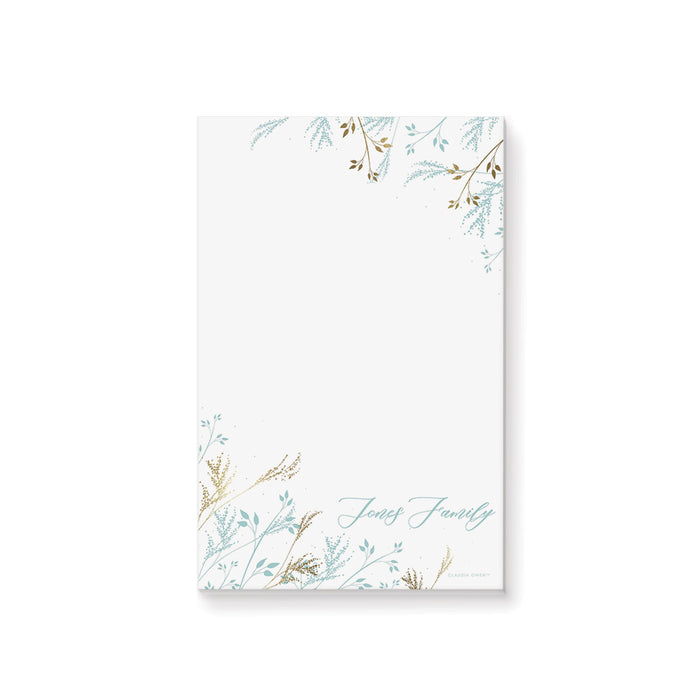 Infuse a touch of seasonal elegance into your everyday notes with this personalized notepad, beautifully adorned with delicate icy blue and soft gold foliage. The subtle and graceful design captures the calm charm of winter, making it perfect for jotting down to-dos, holiday lists, recipes, or warm messages to loved ones. Ideal for adding a little beauty to even the busiest days, this notepad seamlessly combines function and finesse.