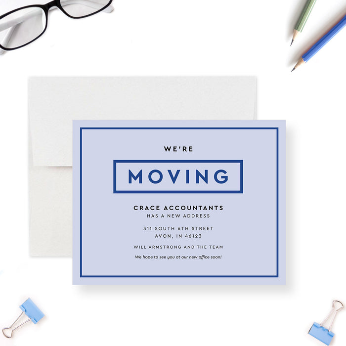 Make a bold statement with our sleek and modern minimalist moving announcement card. This isn't just any announcement – it's crafted for sharing the exciting news with your valued clients, partners, and everyone connected to your business journey.