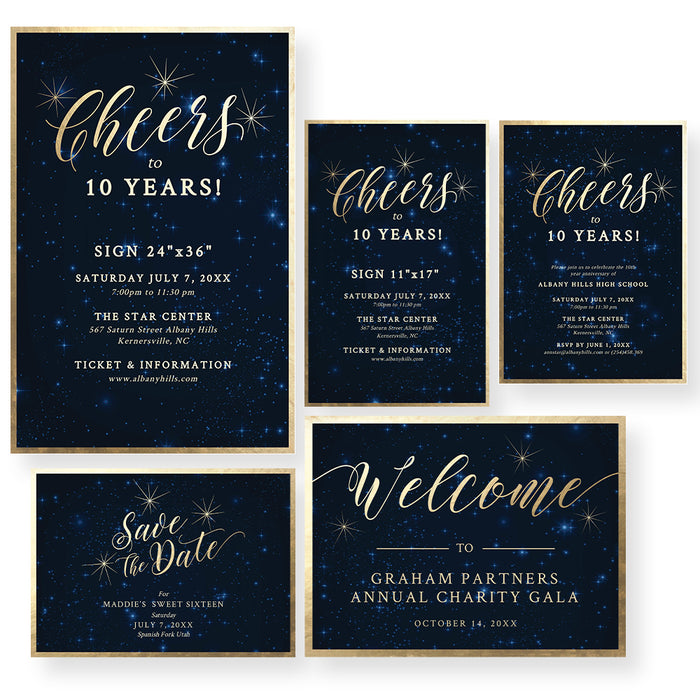 Cheers to 10 Years Party Invitation with Matching Signs and Save the Date, Starry Night Sky, Business or Wedding Anniversary Invites Digital Download