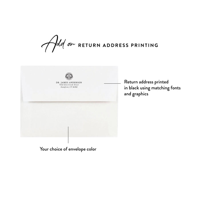 RETURN ADDRESS PRINTING. Take the hassle out of addressing your envelopes by adding return address printing. The black ink printing on the envelope flap will match the font and style of your personalized note cards, giving your entire set a cohesive look.