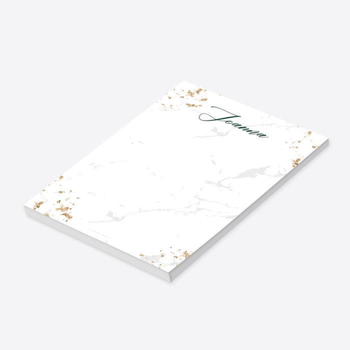 Elevate your everyday writing with this elegant, personalized notepad. Featuring a sleek white marble background and soft gold splatter details, this notepad is ideal for jotting down thoughts, meeting notes, daily to-dos, or creative ideas. Whether you're in the office, working from home, or planning your week, it’s a beautiful and practical accessory that brings effortless elegance to your writing routine.