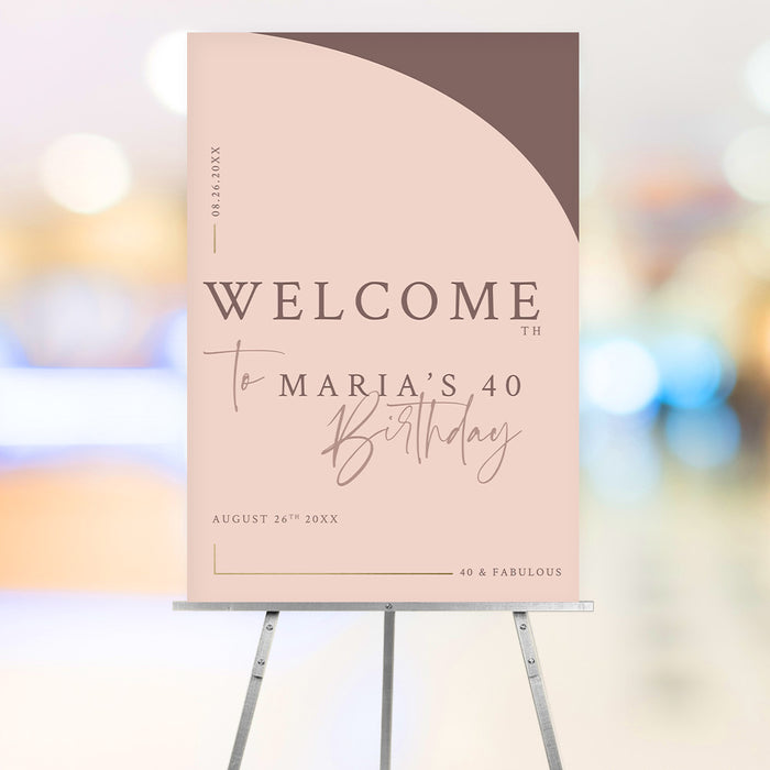 Make a lasting first impression at your celebration with this elegant 40th birthday welcome sign, featuring a modern half-arch design in beige and brown tones. This customizable signage is perfect for milestone birthdays and can be edited with your name, age, and event date—making it a truly personalized welcome sign.