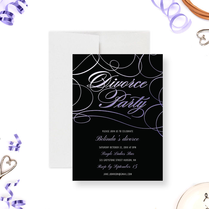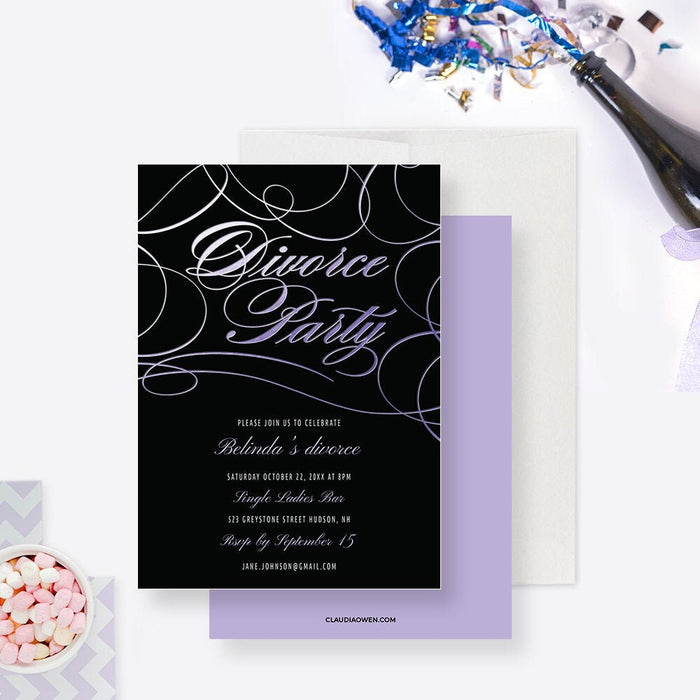 Celebrate the end of one chapter and the exciting start of a new one with this playful and cheeky divorce party invitation! Featuring a fun, eye-catching design with the words "Divorce Party" in elegant script, this invitation sets the perfect tone for a night of laughs, freedom, and a little bit of sparkle. Whether you’re raising a glass to newfound freedom or just celebrating the end of a relationship, this card is sure to get your guests excited for a night they won't forget.