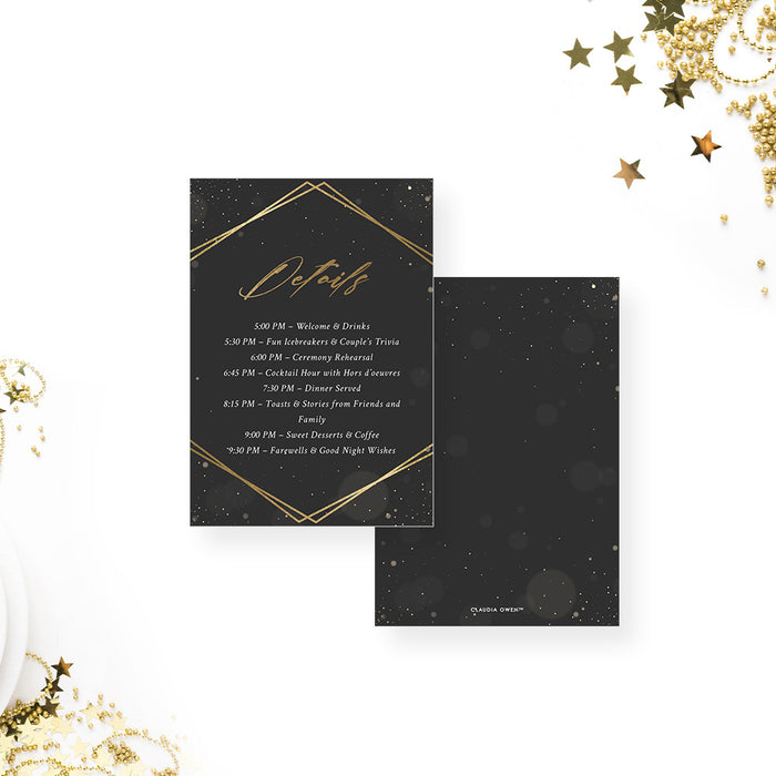 Make your special evening unforgettable with our rehearsal dinner invitation card. Featuring a sophisticated black background with a gold frame and light speckles, this invitation is ideal for a classy pre-wedding celebration. Whether you're planning an intimate dinner or a chic gathering with loved ones, this card is the perfect way to invite guests with elegance and clarity.
