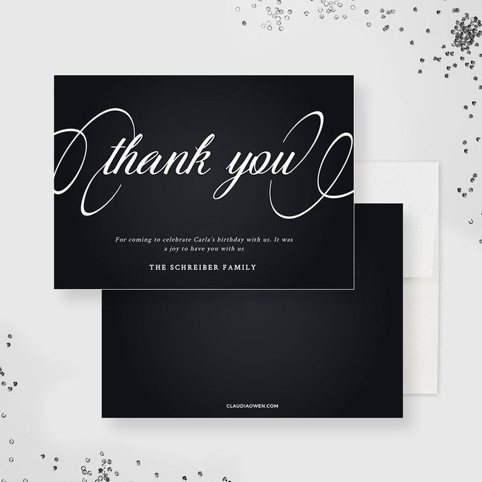 This elegant thank you card features a bold, flowing "thank you" with delicate, stylish curves, set against a sleek black background for a sophisticated and modern look. Perfect for expressing gratitude after special events such as birthdays, weddings, or family gatherings, this card can be personalized with your message and names. The simple and timeless design also makes it ideal for corporate thank you notes, anniversary parties, holiday celebrations, or any occasion where appreciation is due. A great way to convey your heartfelt thanks in style.