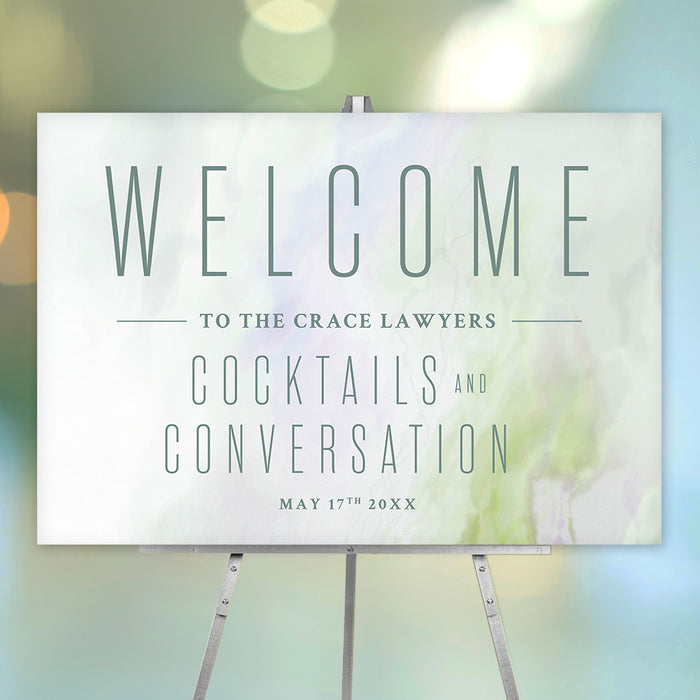 Welcome guests with poise and professionalism using this cocktails and conversation welcome sign—perfect for law firms, professional mixers, or sophisticated corporate events. Featuring a soft watercolor background in muted pastel tones and modern typography, this sign establishes a warm and polished tone from the moment guests arrive.