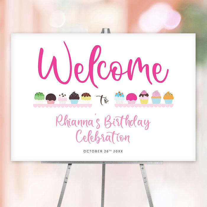 Fun and Colorful Birthday Welcome Sign with Cute Cupcakes, Cake Decorating Party Welcome Sign with Sweet Treats