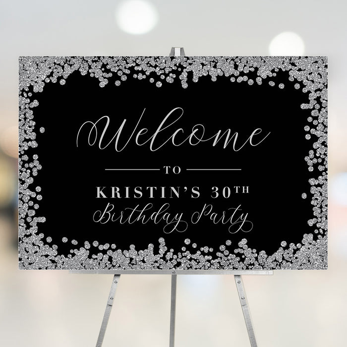 Glam Birthday Party Welcome Sign Featuring Faux Silver Sparkles