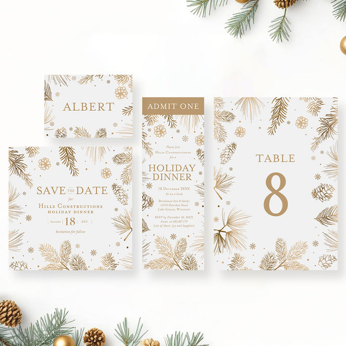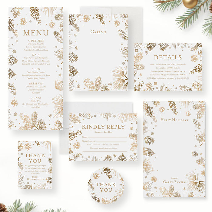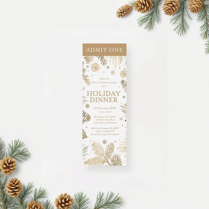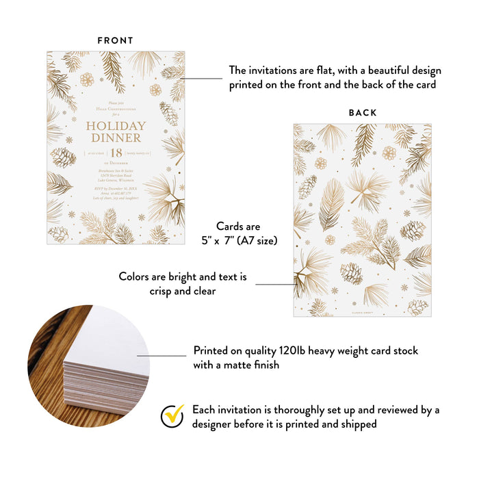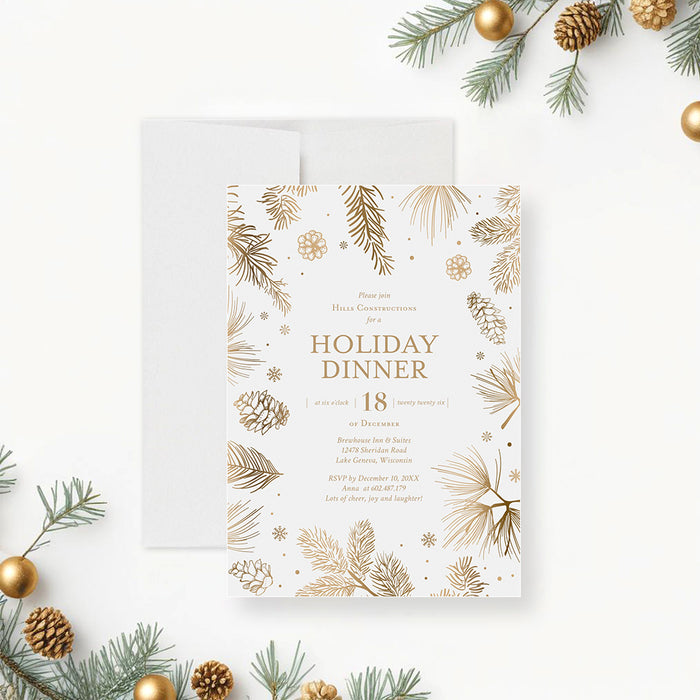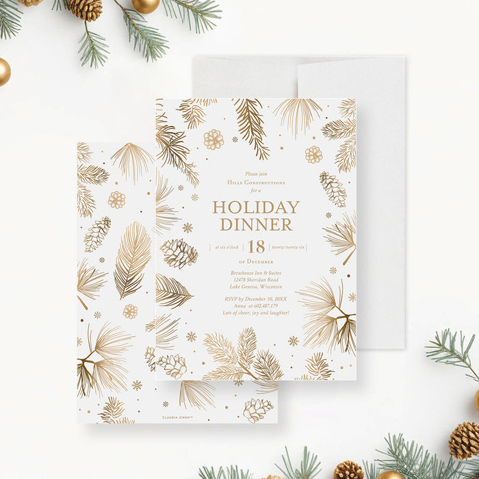 Holiday Dinner Invitation Card Featuring Pine Boughs Pinecones and Snowflakes, Christmas Party Invitation