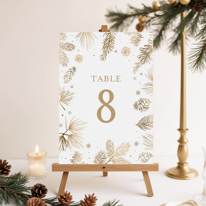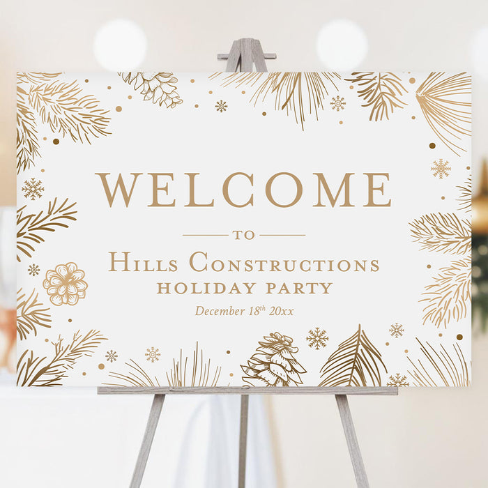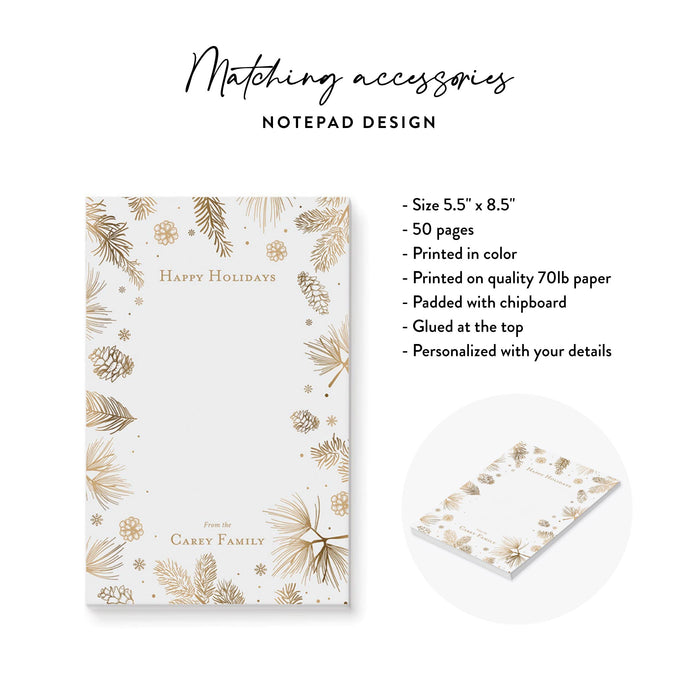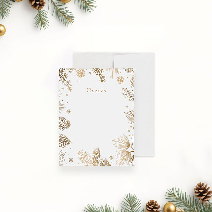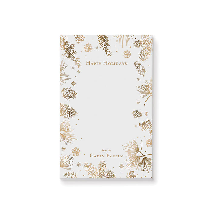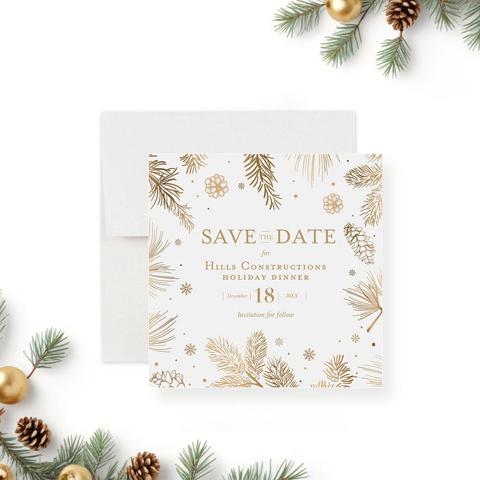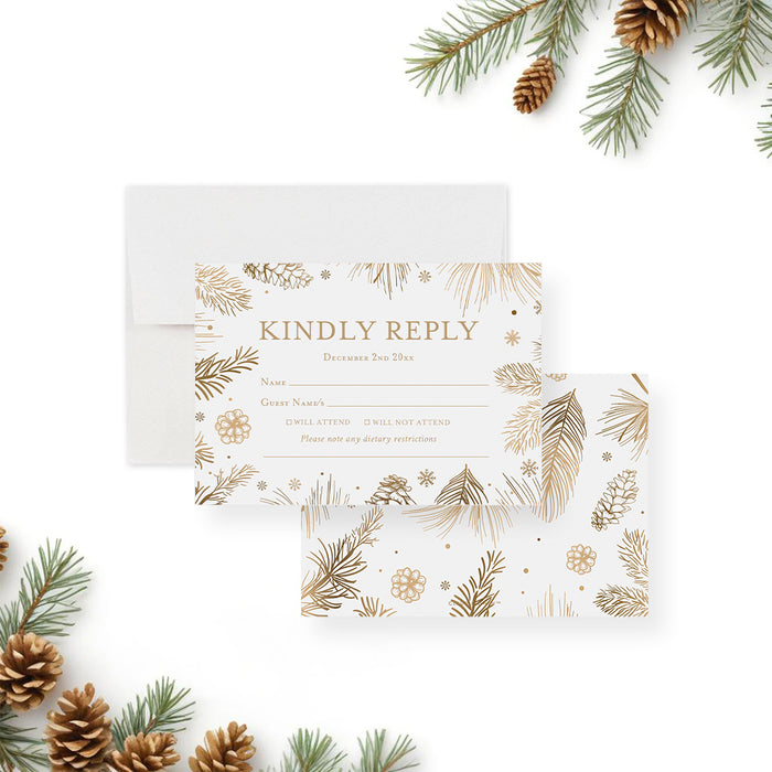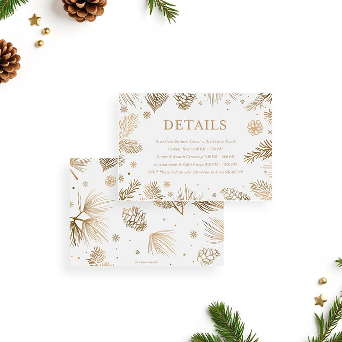 Celebrate this wonderful season in style with our beautifully crafted holiday party invitation! Adorned with charming, hand-drawn gold botanical illustrations of pine boughs, pinecones, and delicate snowflakes, this card is just right for creating a joyful and festive atmosphere for your upcoming gathering.