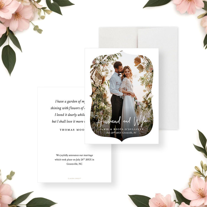 This elegant wedding announcement card beautifully captures the essence of love and celebration. It is perfect for announcing the beginning of your new chapter. The soft, romantic design pairs wonderfully with the clean and simple typography, which reads "Husband and Wife," adding a personal and heartfelt touch.