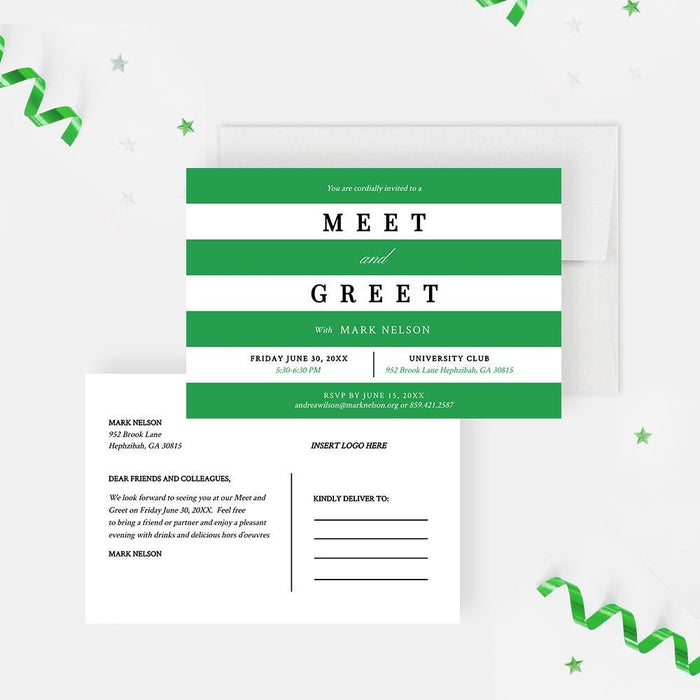 Meet and Greet Postcard Template Digital Download Green and White Stripes